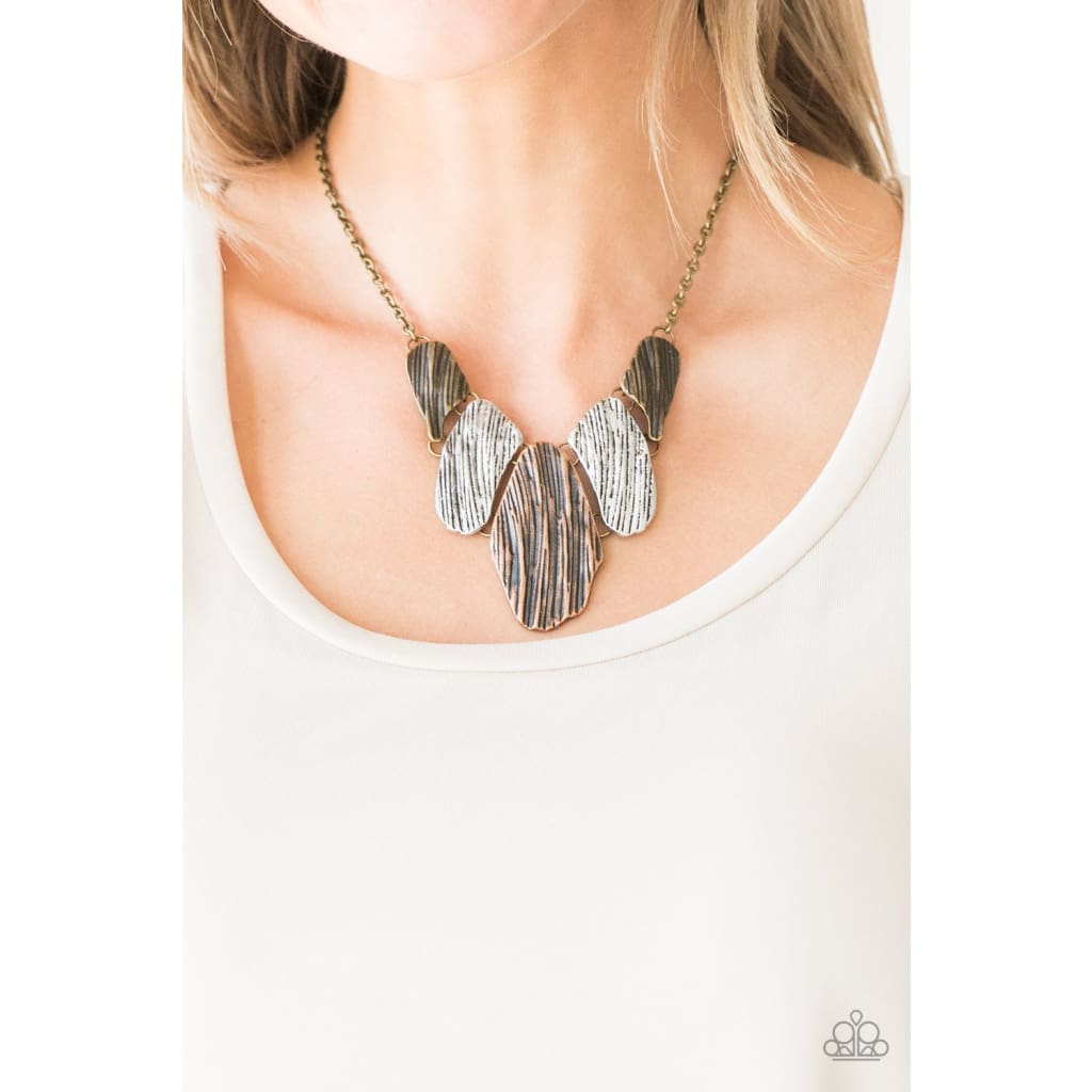 Engraved in antiqued textures, asymmetrical brass, copper, and silver plates link below the collar for an edgy look. Features an adjustable clasp closure.