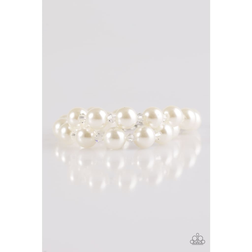 Rows of dainty crystal-like beads and classic white pearls are strung across the wrist for a timeless look. Features an adjustable clasp closure.
