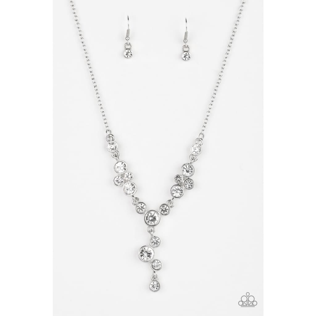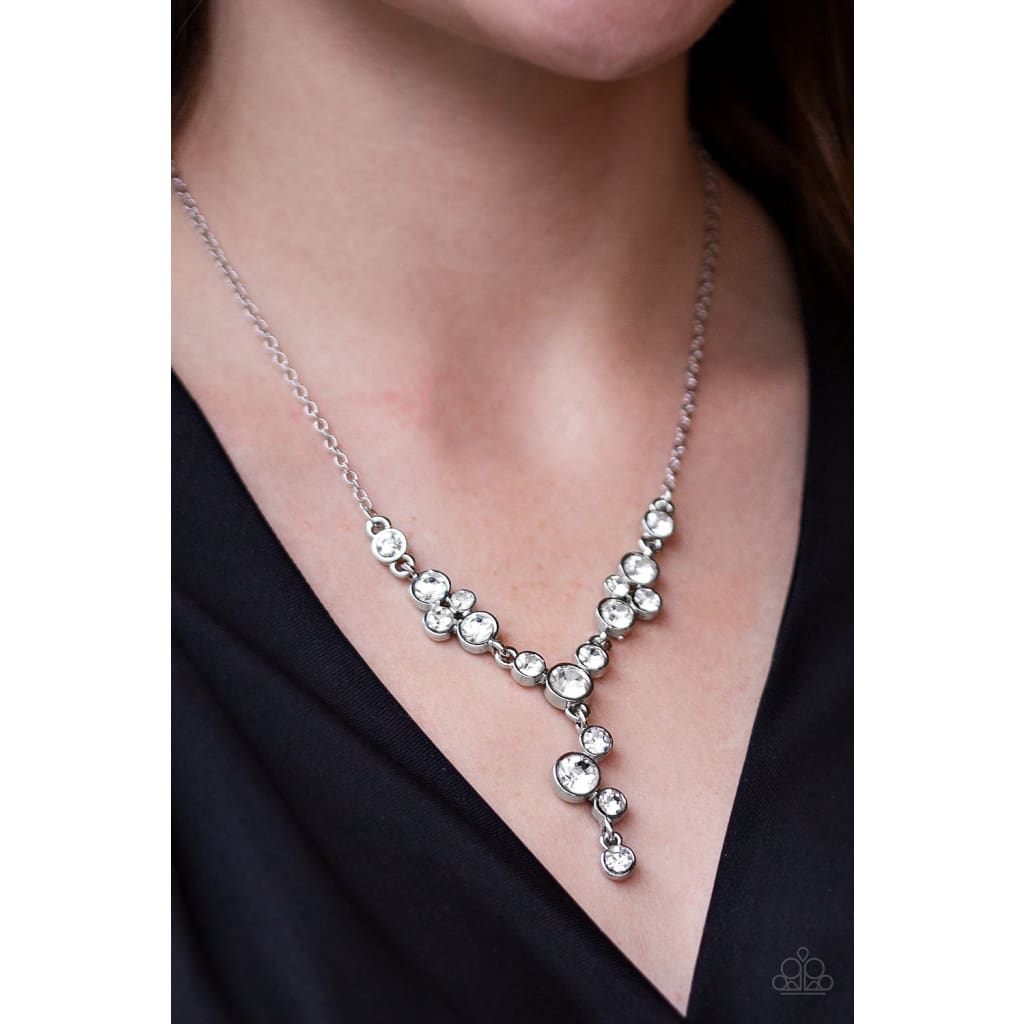 Encased in sleek silver frames, a collection of glittery white rhinestones coalesce into dazzling frames below the collar. Matching rhinestones trickle from the center, creating a glamorous extended pendant. Features an adjustable clasp closure.