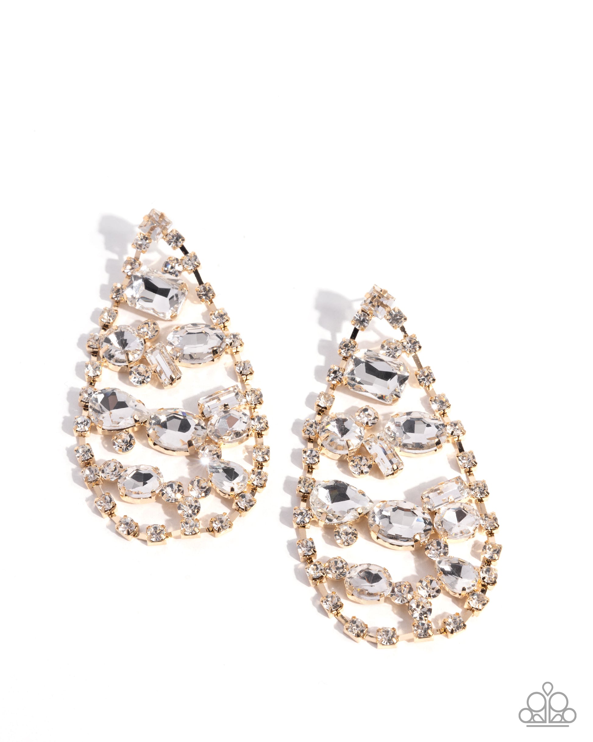 Sparkling white rhinestones are arranged in intricate patterns along teardrop-shaped gold frames, creating a dazzling chandelier-like design. The teardrop, round, oval, and emerald cuts add to the sparkling theme. Earring attaches to a standard post fitting.