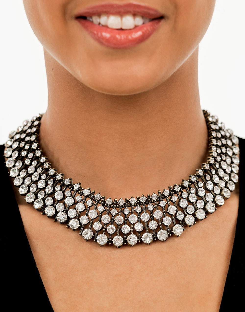 Thin bars of brass, etched in rugged linear texture and dotted with tiny brass studs, are topped by brilliant white rhinestones encased in pronged fittings. The bars are threaded along wires and separated by tiny brass beads, creating a dizzying display along the collar. The collision of glitz and grit fans out along the neckline, inviting onlookers to take a second look at the impeccable detail and dramatic sparkle. Features an adjustable clasp closure.