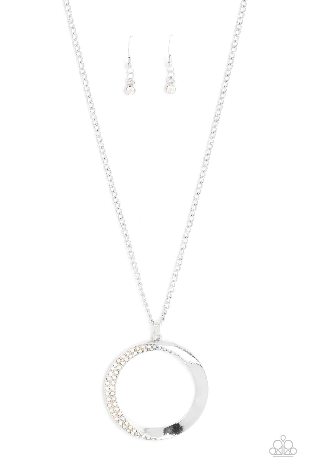 An airy, oversized, warped, shiny silver hoop dangles down the chest from a classic silver chain. Two rows of dainty iridescent rhinestones encrust along the inner curve of the hoop for an understated, elegant dazzle. Features an adjustable clasp closure.