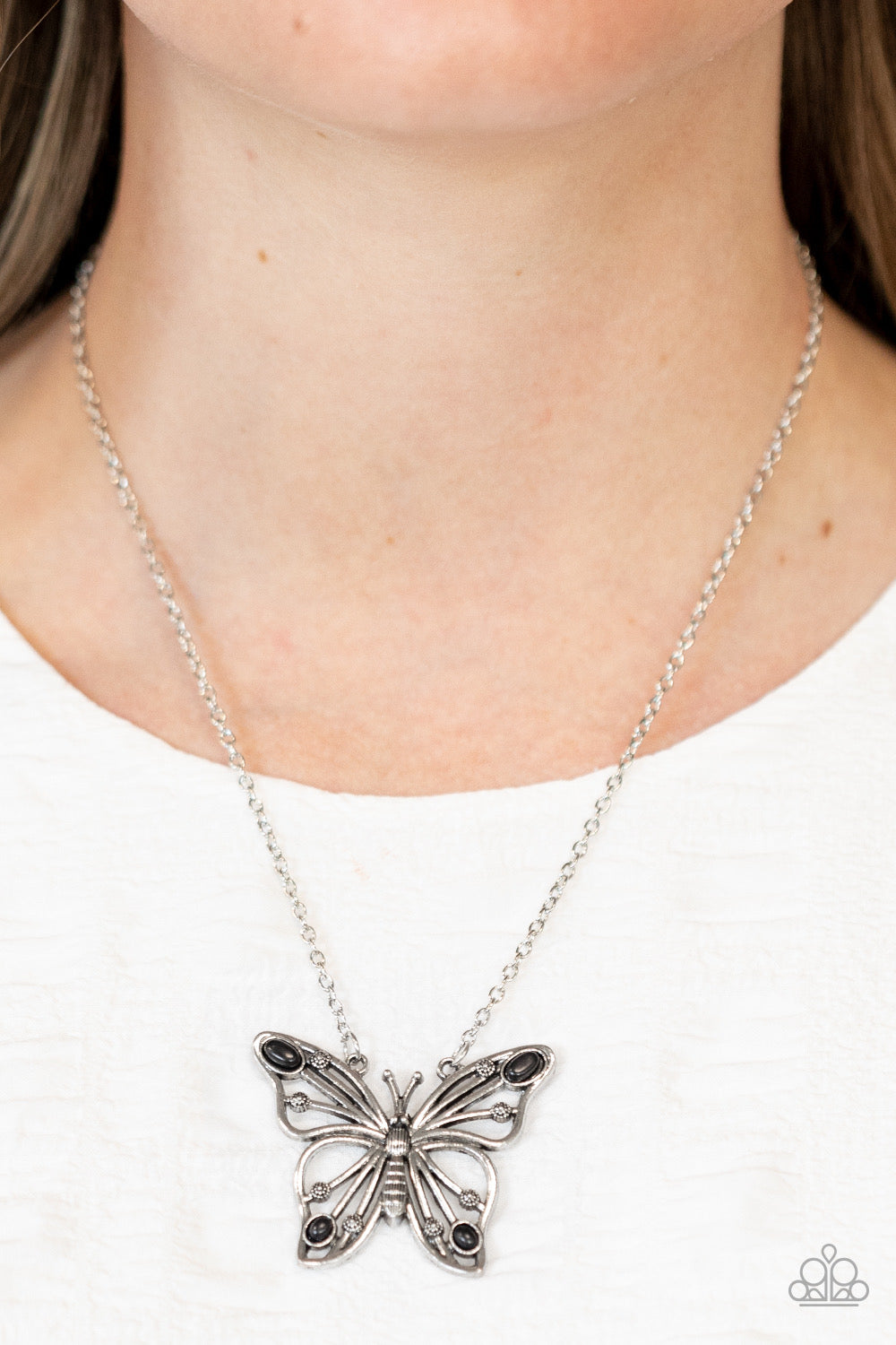 Accented in oval black stones, a decorative silver butterfly flutters at the bottom of a silver chain for a free-spirited finish. Features an adjustable clasp closure.