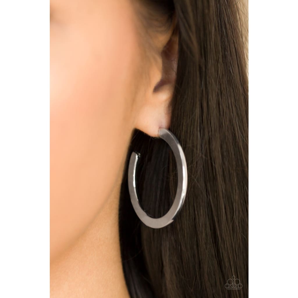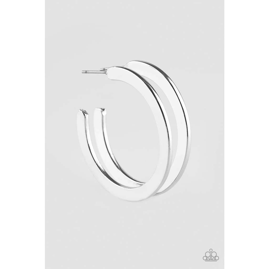 A flat silver bar curls around the ear, creating a casual shine. Earring attaches to a standard post fitting. Hoop measures 1 1/2” in diameter.