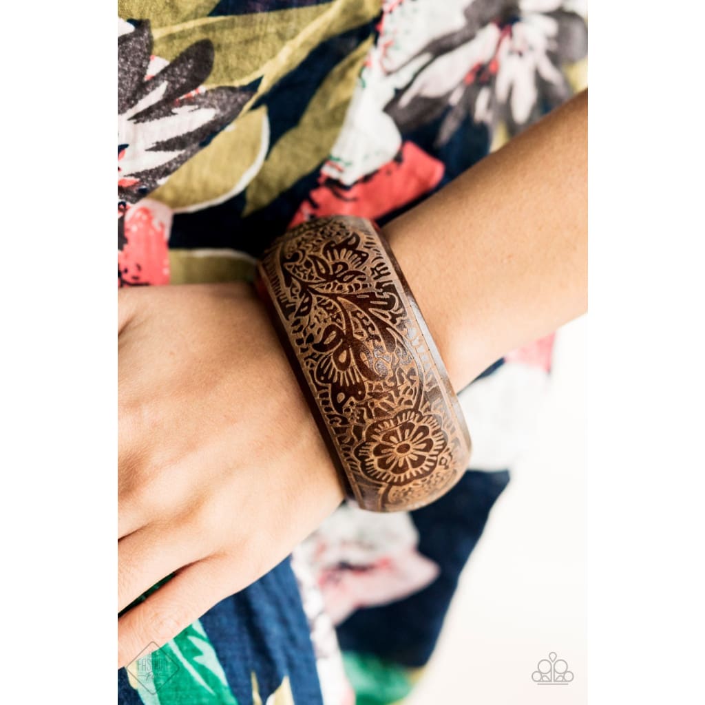 A thick wooden bangle is etched in intricate floral patterns, creating an irresistibly laid-back statement piece.