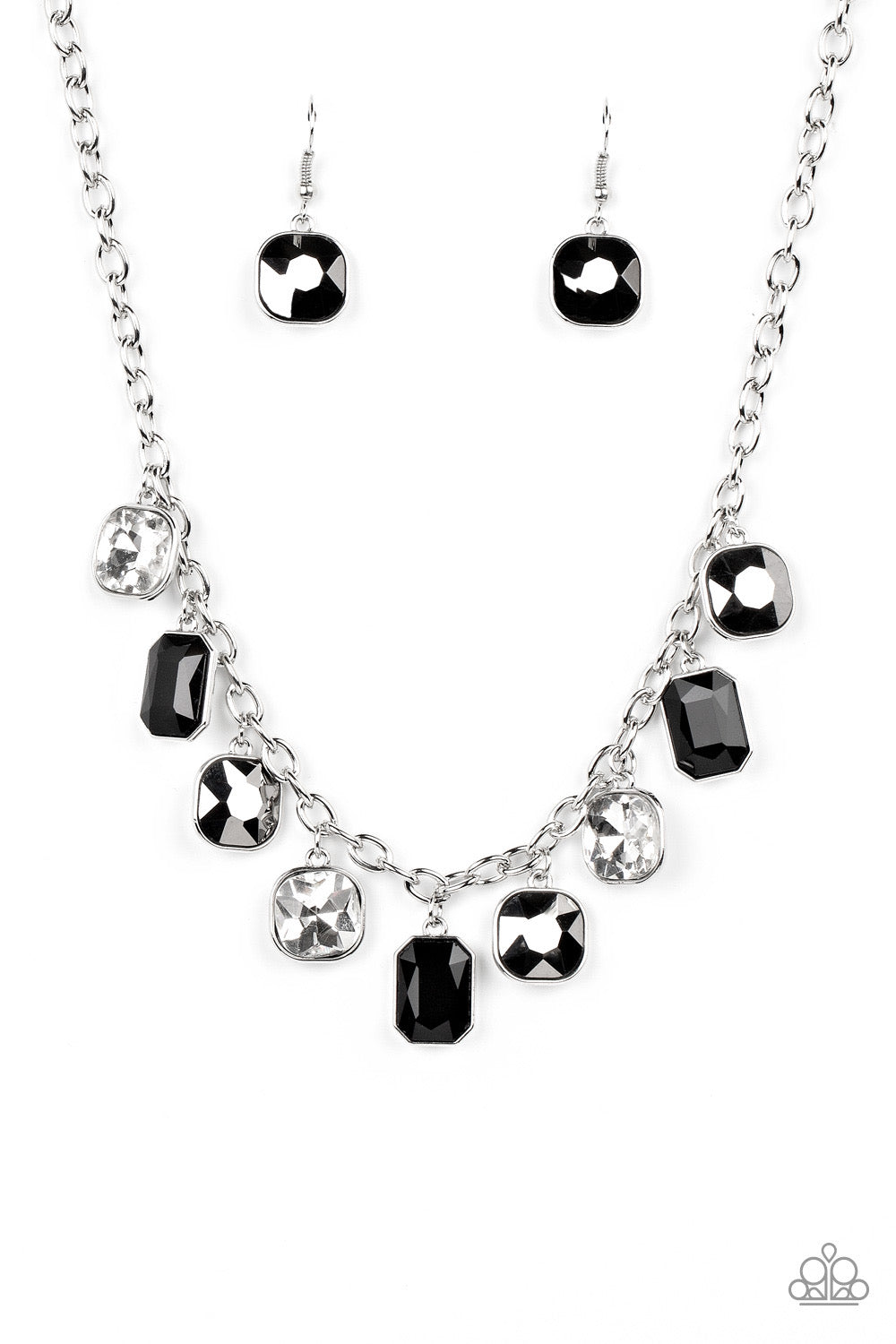 Featuring emerald and radiant style cuts, a sparkly collection of hematite, black, and white rhinestones glitters below the collar, creating an irresistible fringe. Features an adjustable clasp closure.
