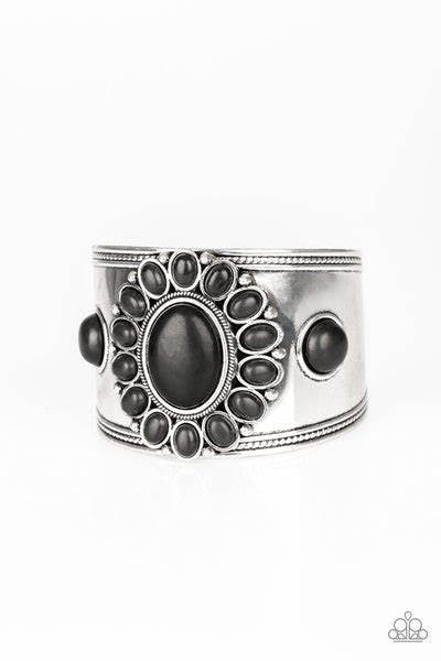 Earthy black stones are pressed into the center of a thick silver cuff, creating a dramatic floral frame atop the wrist.