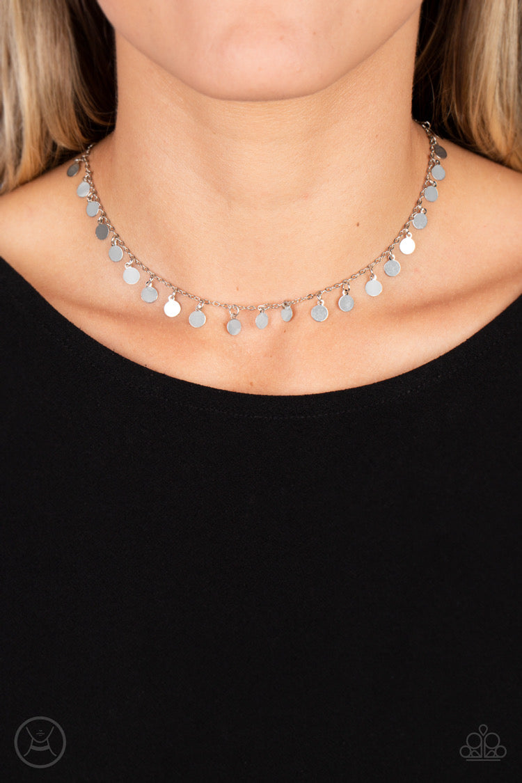 Tiny silver discs dance along a classic silver chain, creating an understated choker necklace. The reflective surfaces of the discs shimmer brightly, as the light catches their high sheen finish to exaggerate their intensity. Features an adjustable clasp closure.