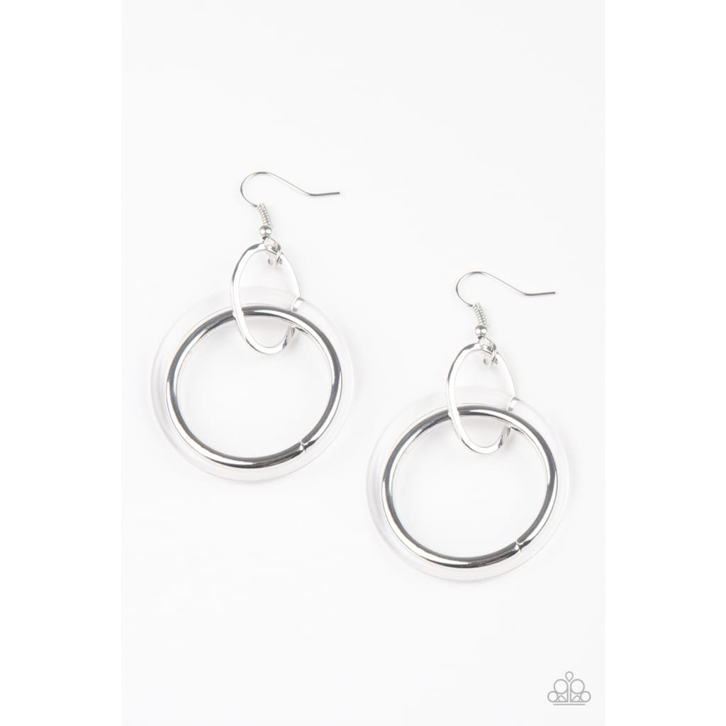 A shimmery silver hoop and clear hoop swing from the bottom of a glistening silver fitting, creating an edgy lure. Earring attaches to a standard fishhook fitting.