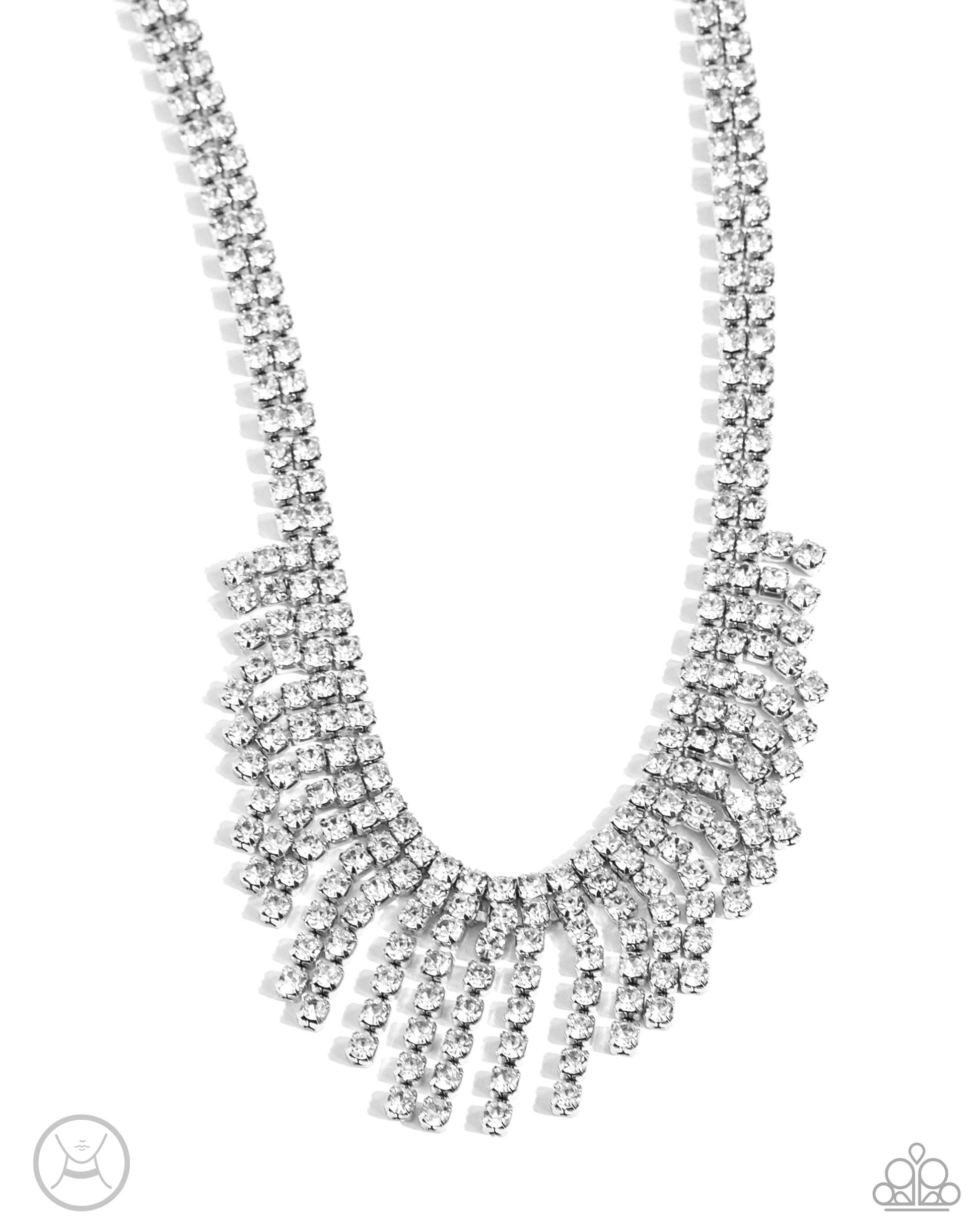 A double-stranded chain of dainty white rhinestones in silver square fittings leads the eye down to a fringe of gems in square fittings that drip in varying lengths down the collar, creating a sparkling display. Features an adjustable clasp closure.