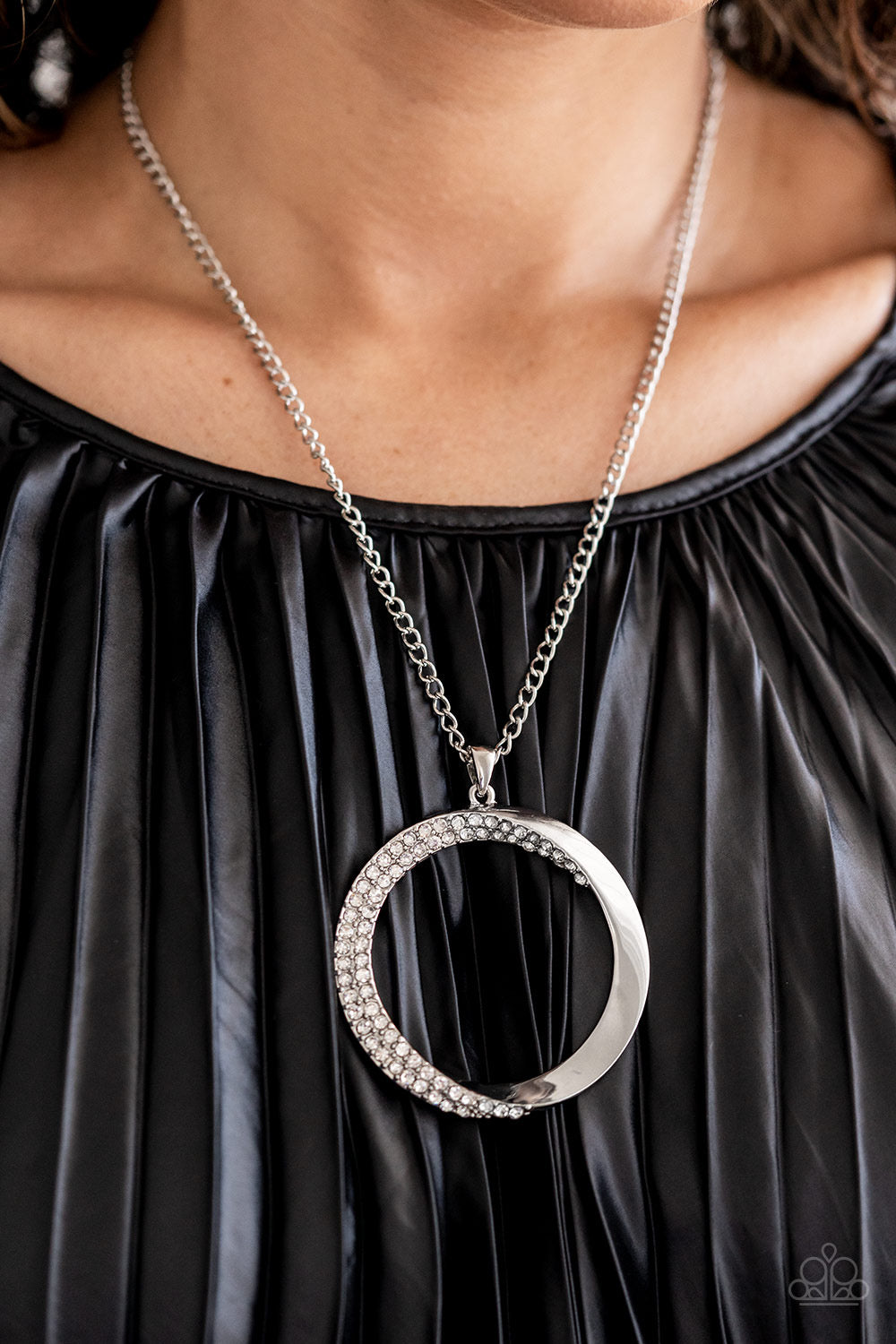 An airy, oversized, warped, shiny silver hoop dangles down the chest from a classic silver chain. Two rows of dainty white rhinestones encrust along the inner curve of the hoop for an understated, elegant dazzle. Features an adjustable clasp closure.