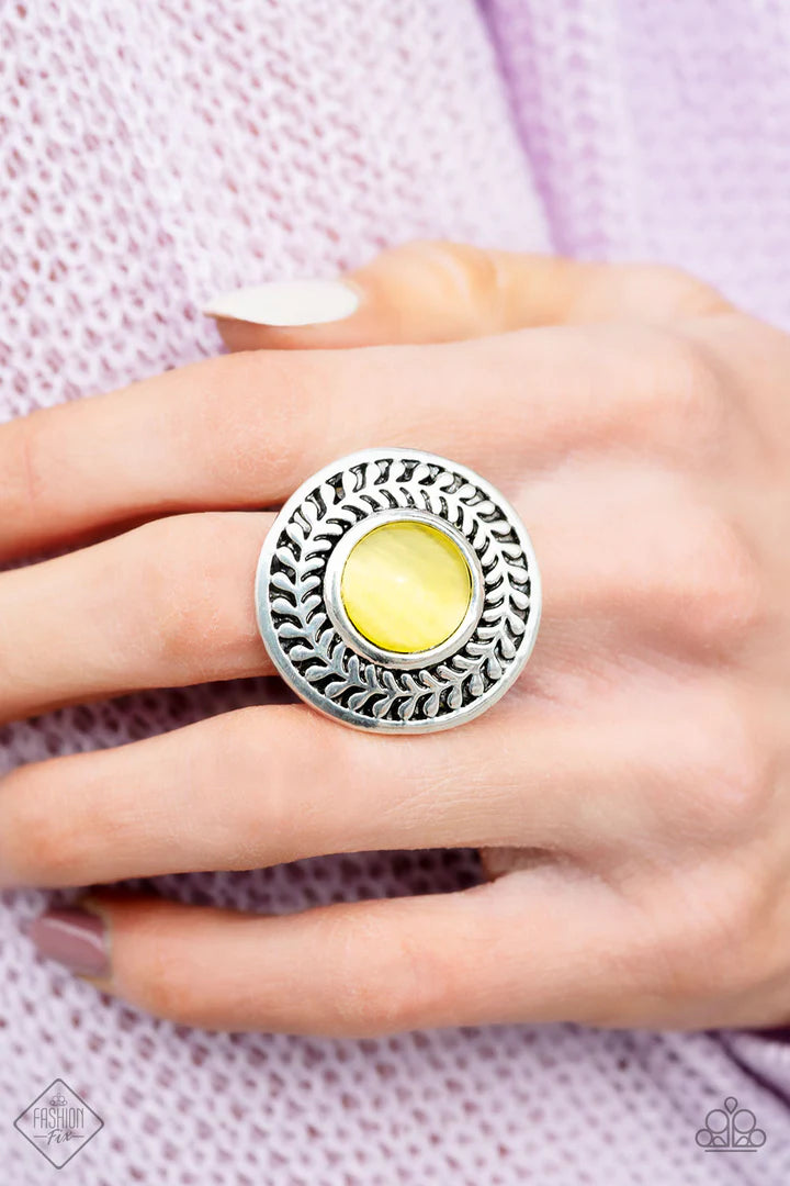 A glowing yellow cat's eye is pressed into the center of an oversized circular silver frame. The casing is embellished with a leafy pattern for a whimsical look. Features a stretchy band for a flexible fit.