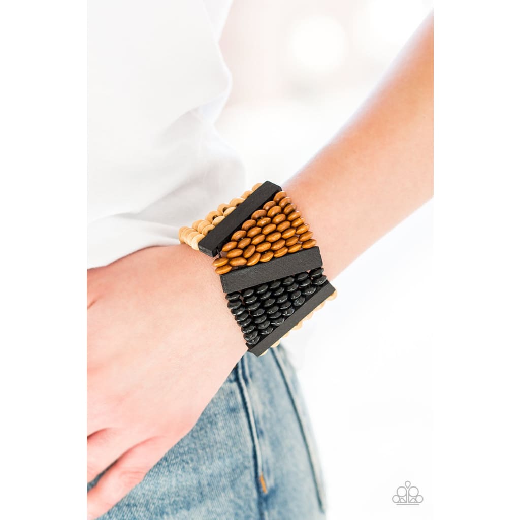 A collection of round and rectangular wooden beads are threaded along stretchy bands, coalescing into an earthy beaded palette for a summery look.