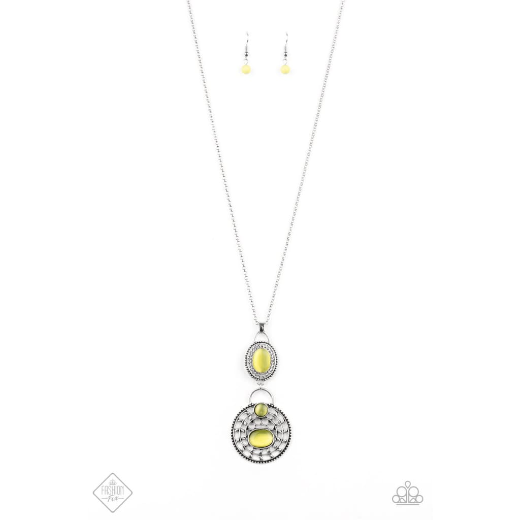 Dotted with glowing yellow cat's eye accents, two dizzying silver frames swing at the bottom of a lengthened silver chain. The stacked pendants swirl with studded patterns and vine-like filigree for a seasonal flair. Features an adjustable clasp closure.