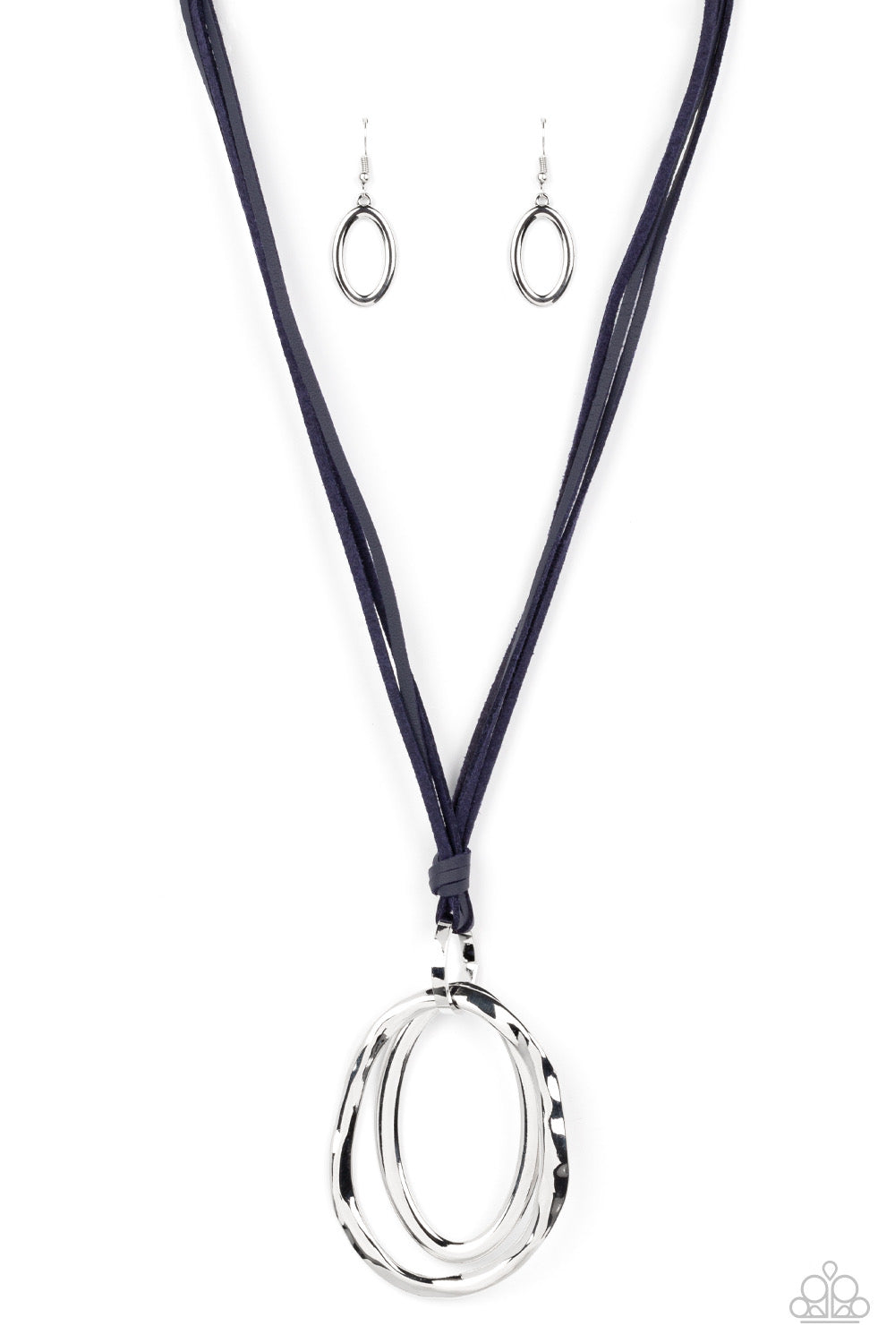 Long strips of navy blue leather knot around a silver link where a mismatched pair of smooth and hammered silver ovals swing from the bottom, resulting in a rustic pendant. Features an adjustable clasp closure.