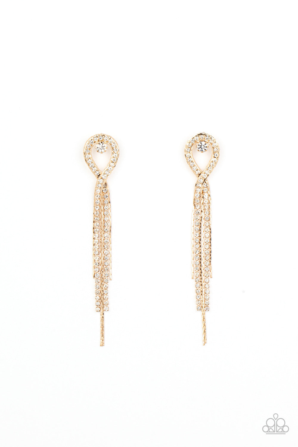 A lasso of glassy white rhinestones nestles around a solitaire white rhinestone, while a tassel of flat gold chains stream out from the bottom for a glamorous finish. Earring attaches to a standard post fitting.