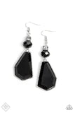 Earring: "Defaced Dimension" (P5ED-BKXX-123DX)- A shiny metallic bead, a white rhinestone encrusted accent, and a black defaced bead stack together above an oversized defaced bead. The sleek black asymmetrical pendant is encased in a studded silver frame, creating an edgy lure. Earring attaches to a standard fishhook fitting.