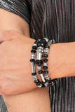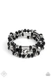 Bracelet: "Dynamic Dazzle" (P9RE-BKXX-357DX)- Stacks of black and silver faceted beads, interspersed with silver cylindrical accents and rhinestone-encrusted beads, are threaded along an infinity wrap-style bracelet making an intensely dynamic statement around the