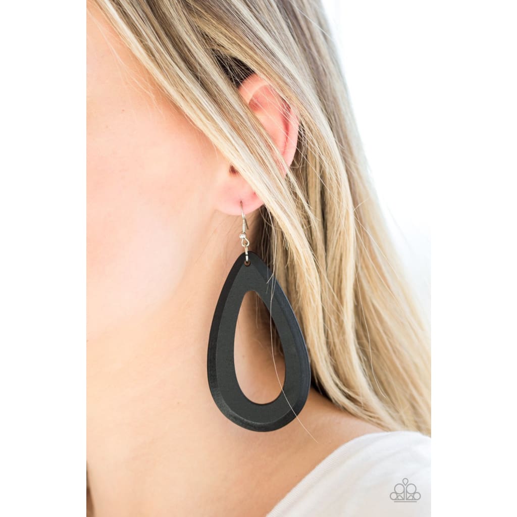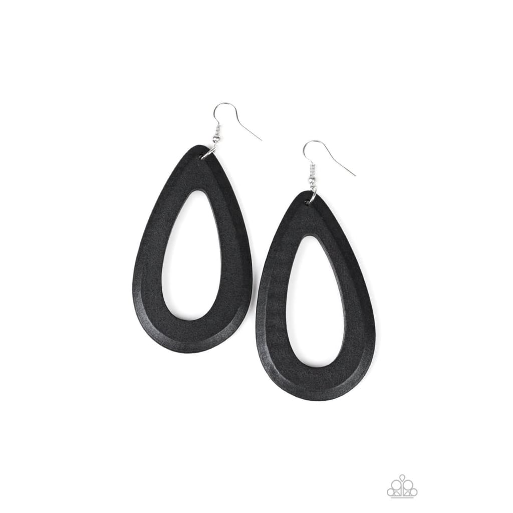 Brushed in a shiny black finish, an airy wooden teardrop frame swings from the ear in a seasonal fashion. Earring attaches to a standard fishhook fitting.