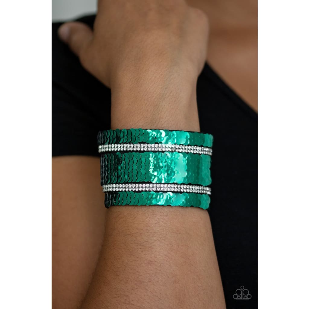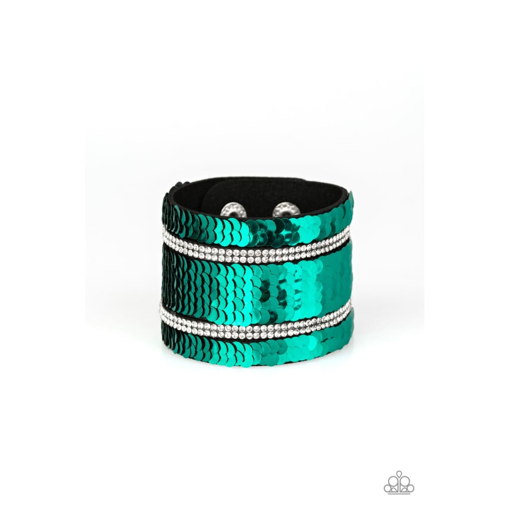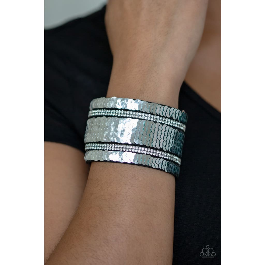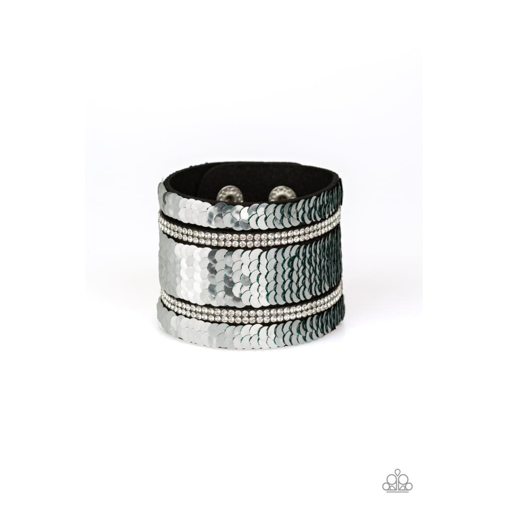Infused with strands of blinding white rhinestones, row after row of shimmery sequins are stitched across the front of a spliced black suede band. Bracelet features reversible sequins that change from silver to green. Features an adjustable snap closure.