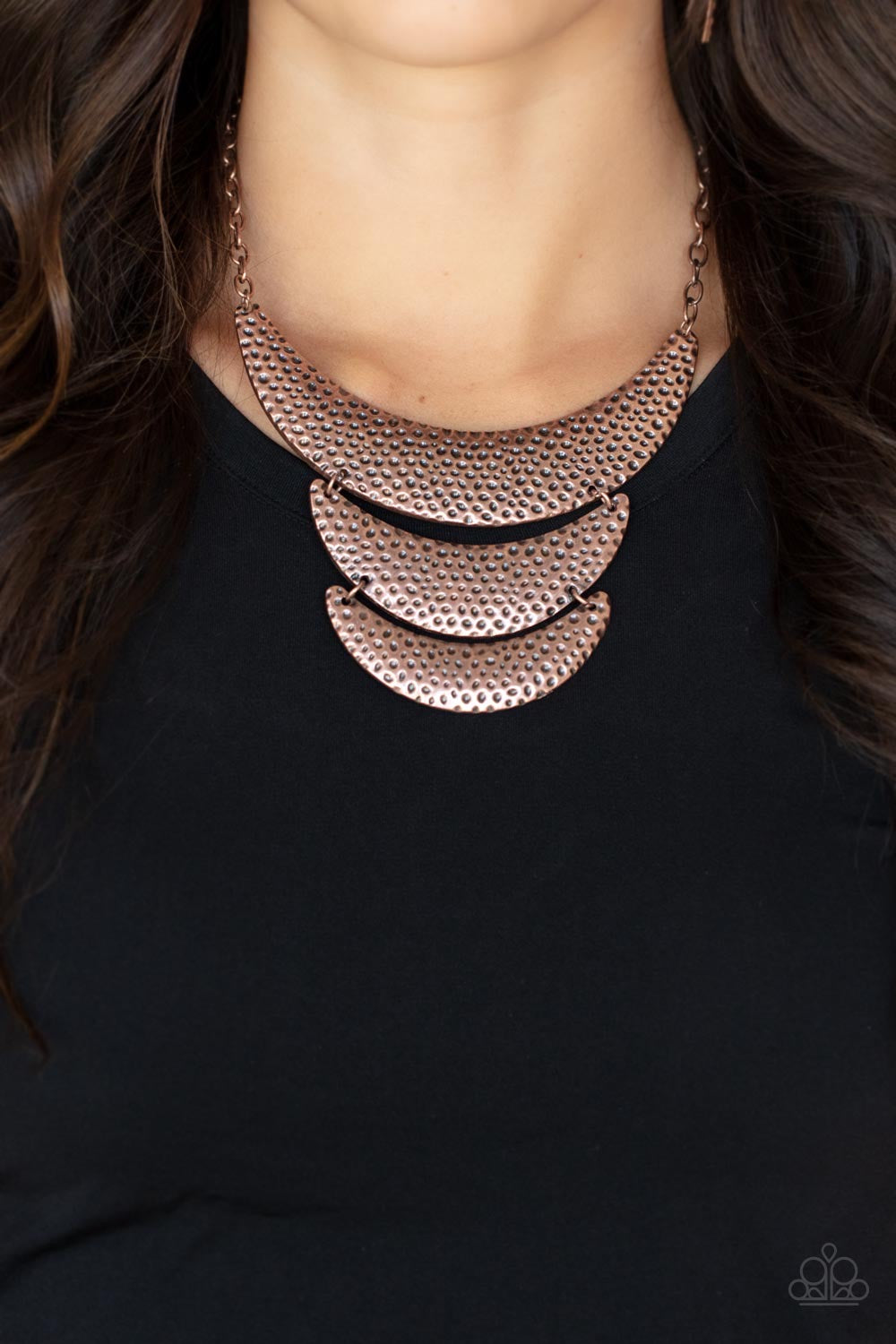 Hammered in an antiqued copper dimpled texture, a trio of crescent shaped plates in graduating sizes stack one above the other and connect to a copper chain for a boldly modern fashion below the collar. Features an adjustable clasp closure.