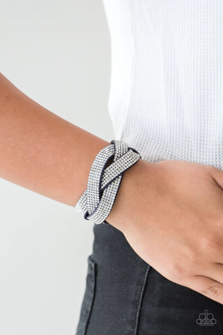 Encrusted in row after row of glittery white rhinestones, three blue suede bands braid across the wrist for a sassy look. Features an adjustable snap closure.
