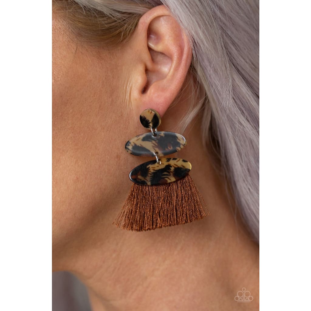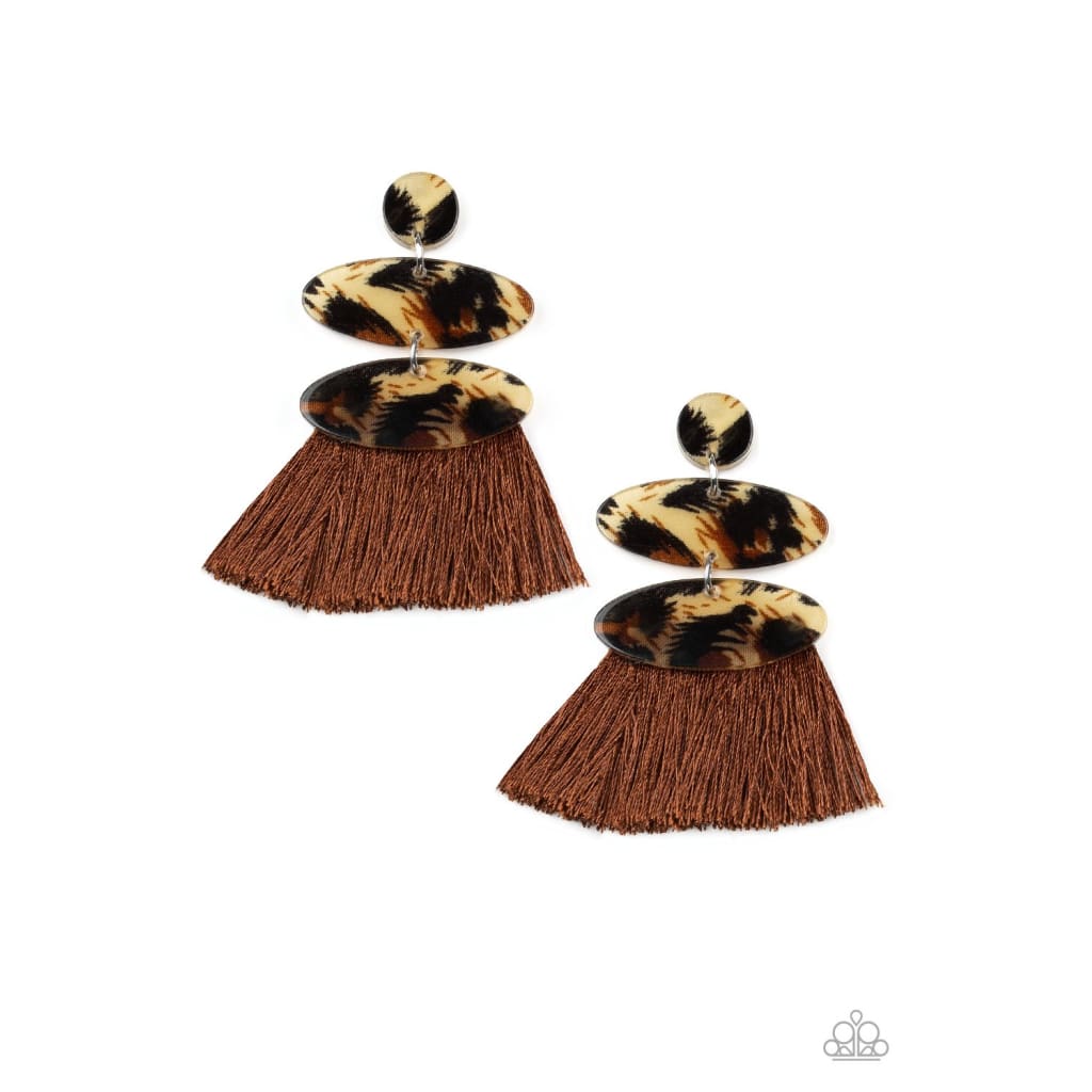Featuring cheetah-like print, glassy frames link into a stacked lure. A fringe of shiny brown thread streams from the bottom of the lure for a retro finish. Earring attaches to a standard post fitting.