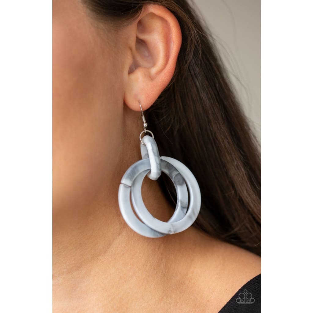 Brushed in a faux marble finish, smoky acrylic hoops dangle from the ear for a retro look. Earring attaches to a standard fishhook fitting.