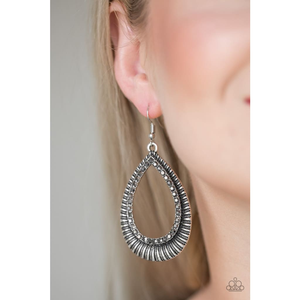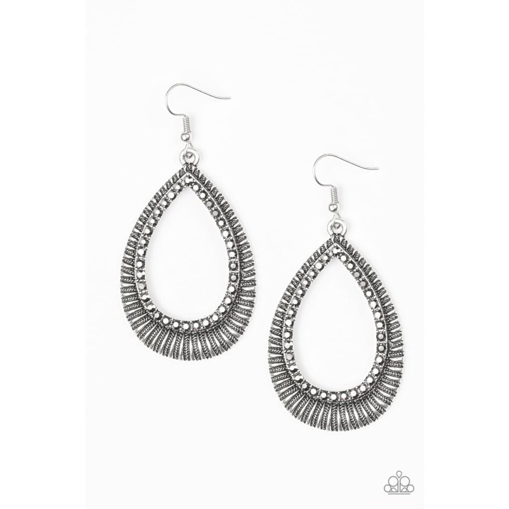 Glittery hematite rhinestones spin around the center of an antiqued silver teardrop radiating with shimmery textures for an edgy look. Earring attaches to a standard fishhook fitting.