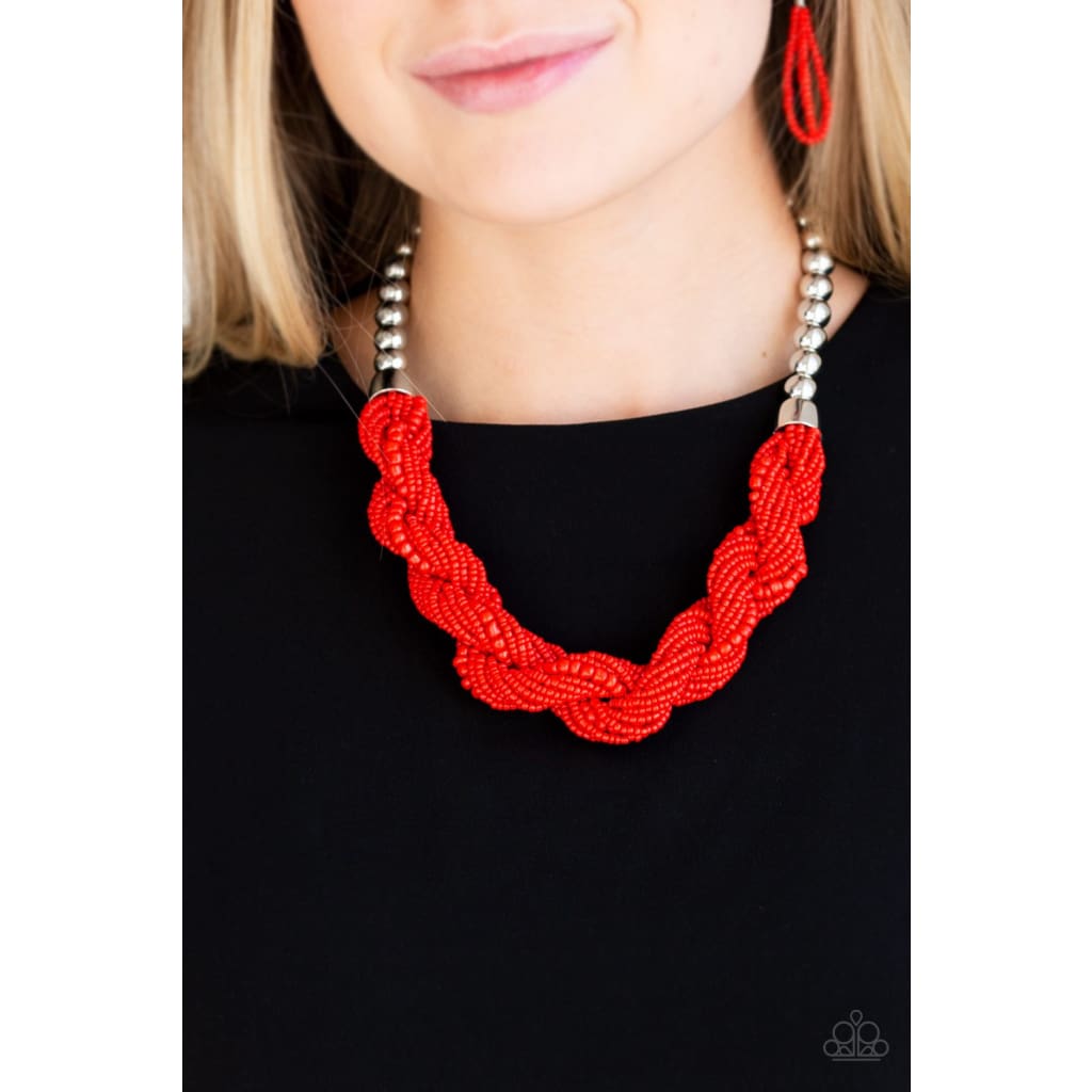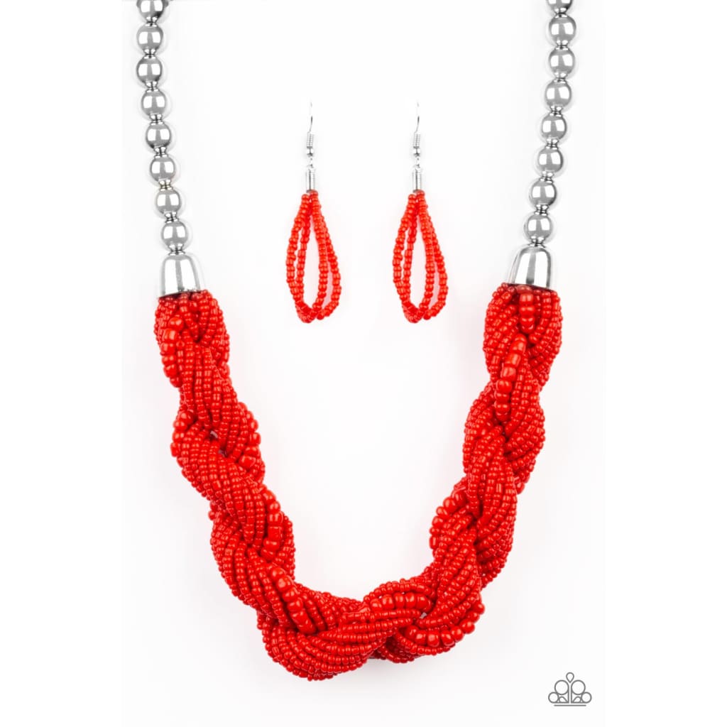 Glistening silver beads give way to strands of twisting red seed beads below the collar for a summery flair. Features an adjustable clasp closure.
