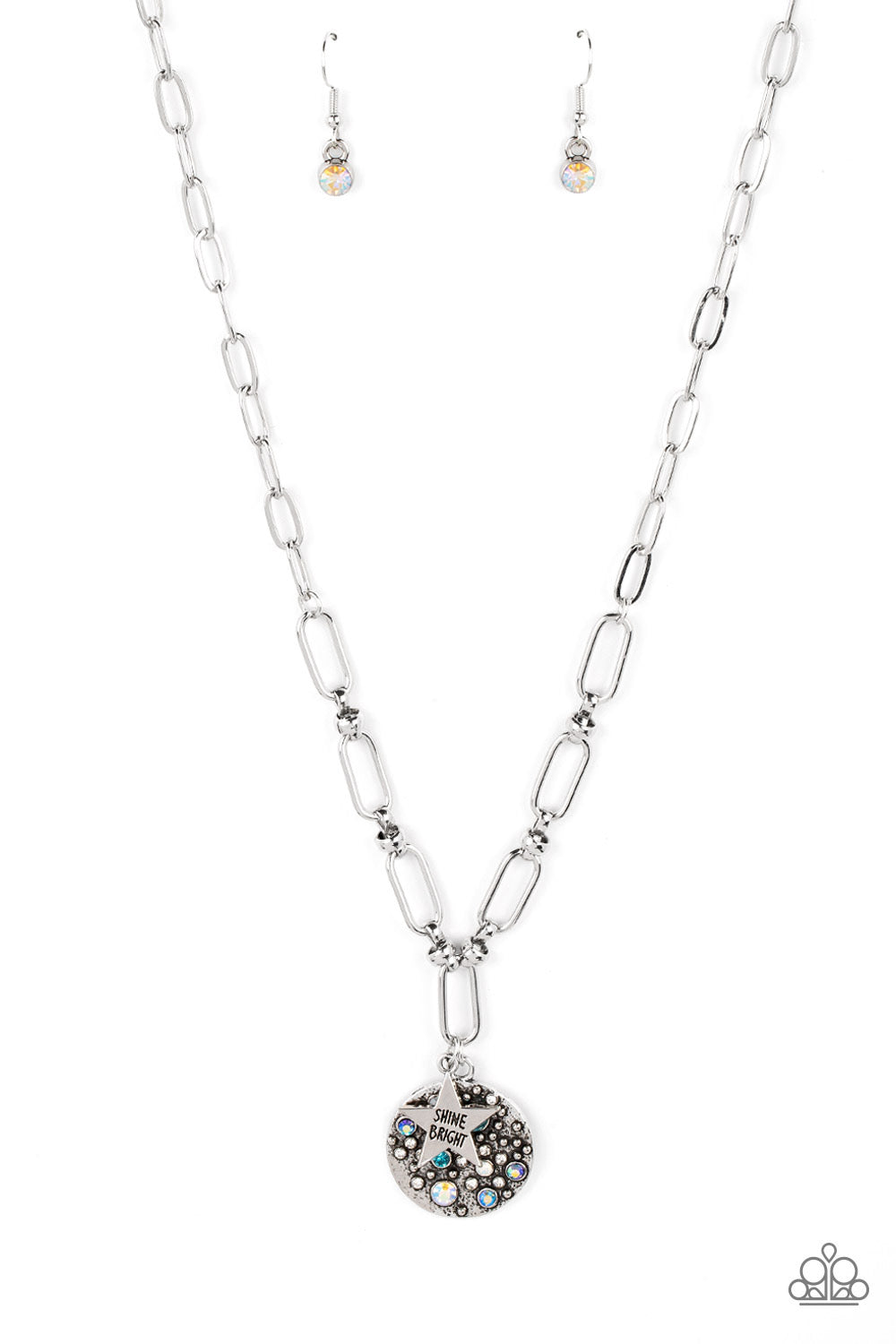 Interlocked silver ovals elongate into longer ovals as they make their way down the neck for some eye-catching detail. Hanging at the bottom of the silver ovals, a silver disc features a spattering of star-dust like rhinestones and studs in shades of light amethyst, aquamarine, opalescent white, and iridescence. A silver star charm stamped with the words "Shine Bright" glides next to the studded disc for a starry finish. Features an adjustable clasp closure. Due to its prismatic palette, color may vary.