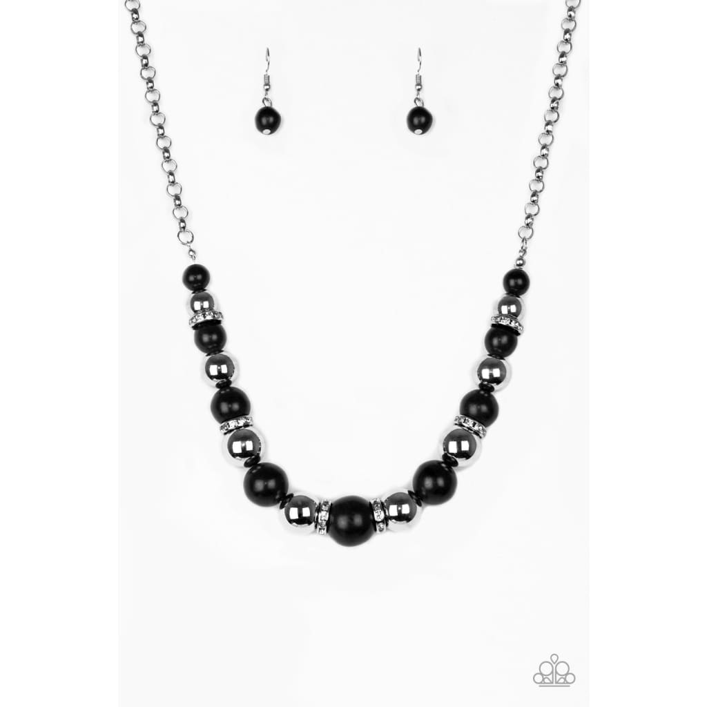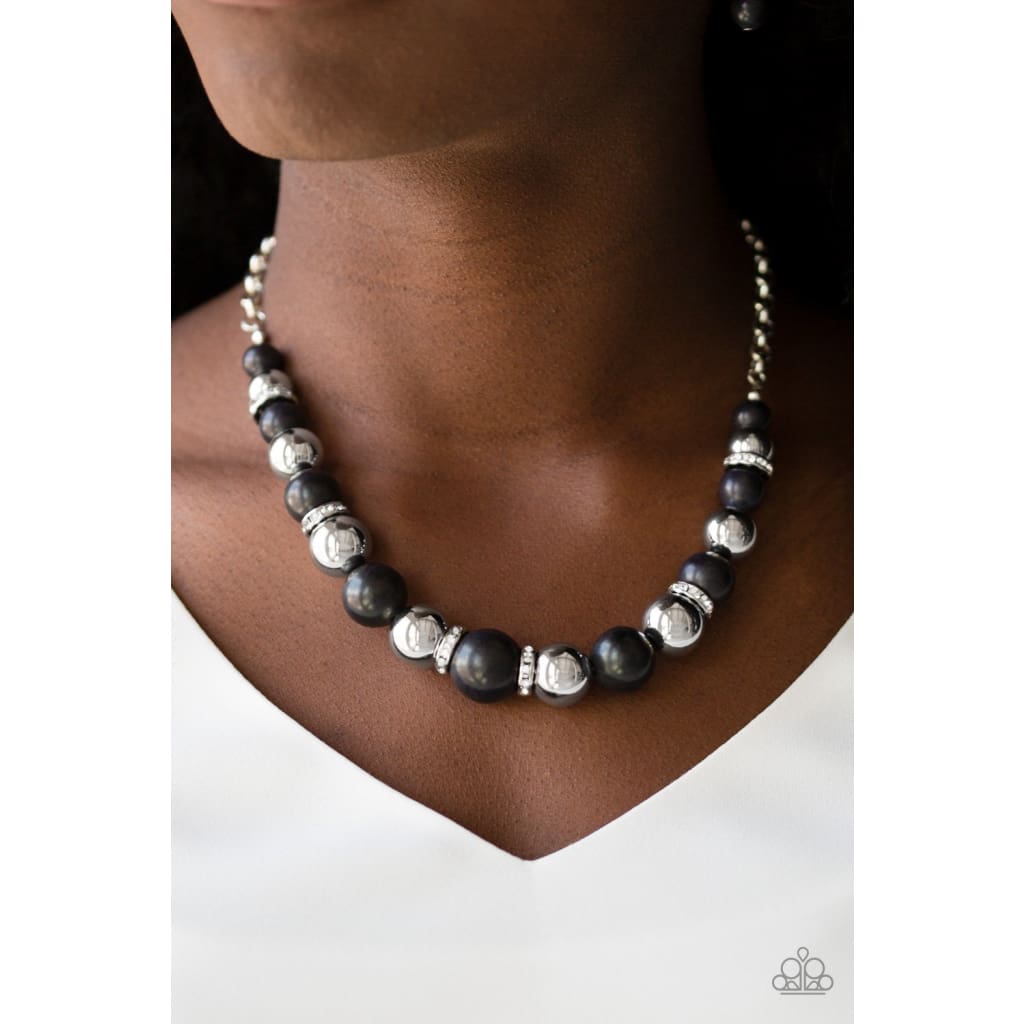 A collection of faux black stones, shiny silver beads, and white rhinestone encrusted rings join below the collar in a refined fashion. Features an adjustable clasp closure.