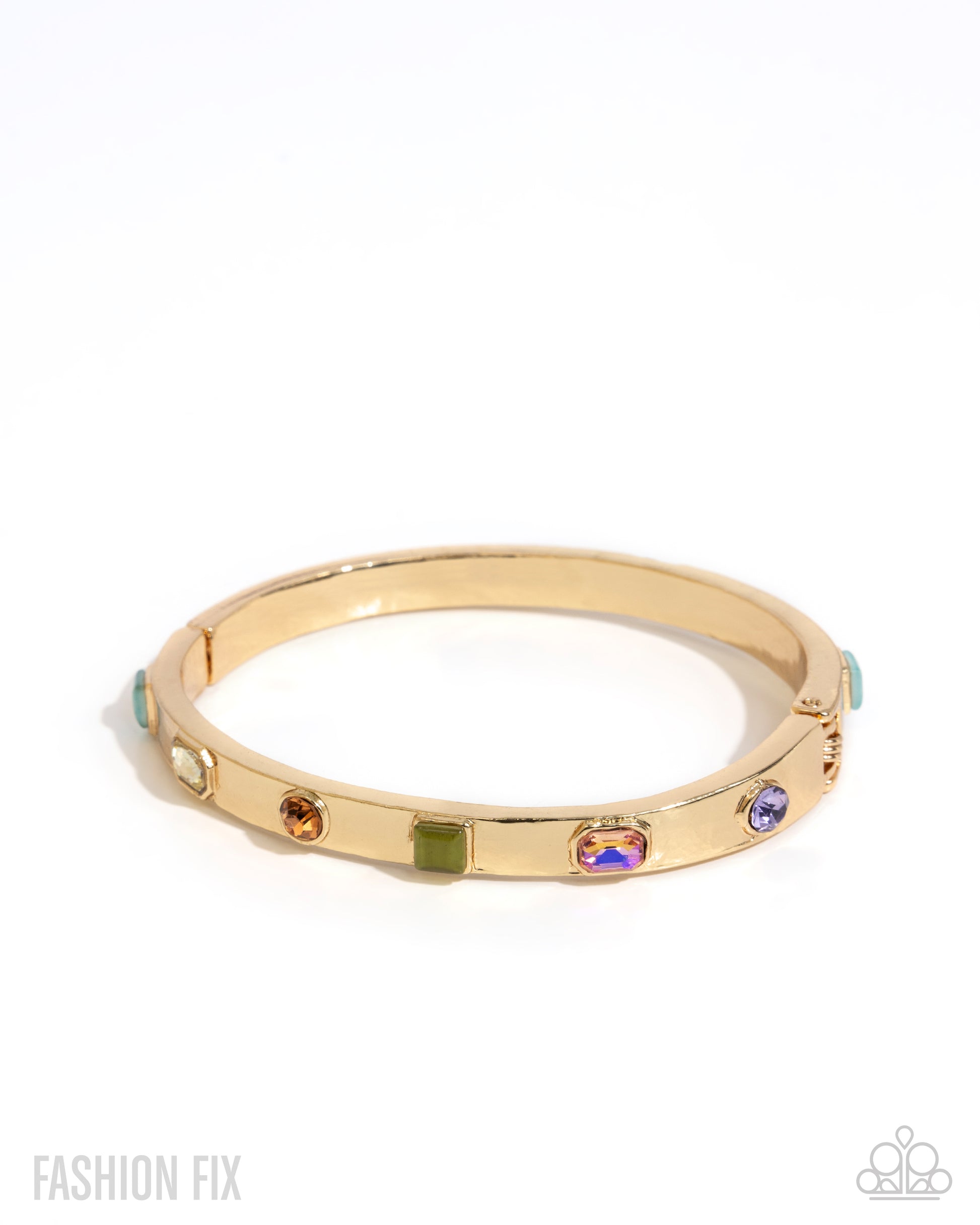 Varying in size, opacity, and cut, an array of multicolored gems, rhinestones, and cat's eye stones are encrusted along the center of a thick gold band, creating a classic, chic centerpiece. Features a hinged closure.