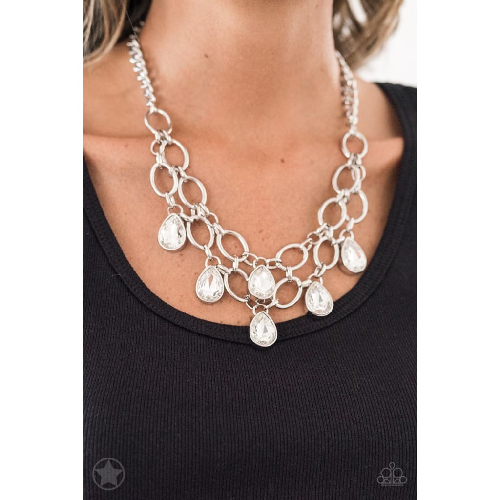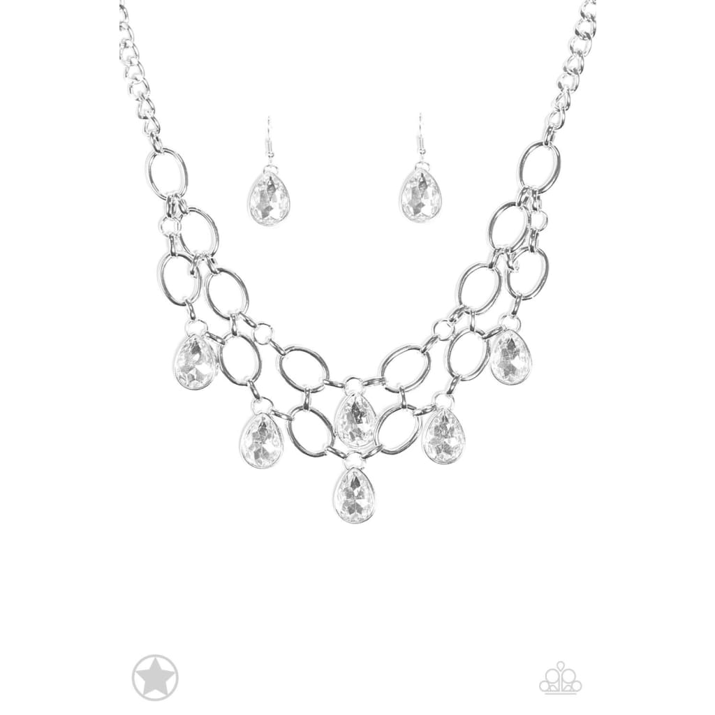Joined by dainty silver links, two rows of dramatic silver chain layer below the collar in a fierce fashion. Glittery white teardrops drip from the glistening layers, adding a timeless shimmer to the show-stopping piece. Features an adjustable clasp closure.