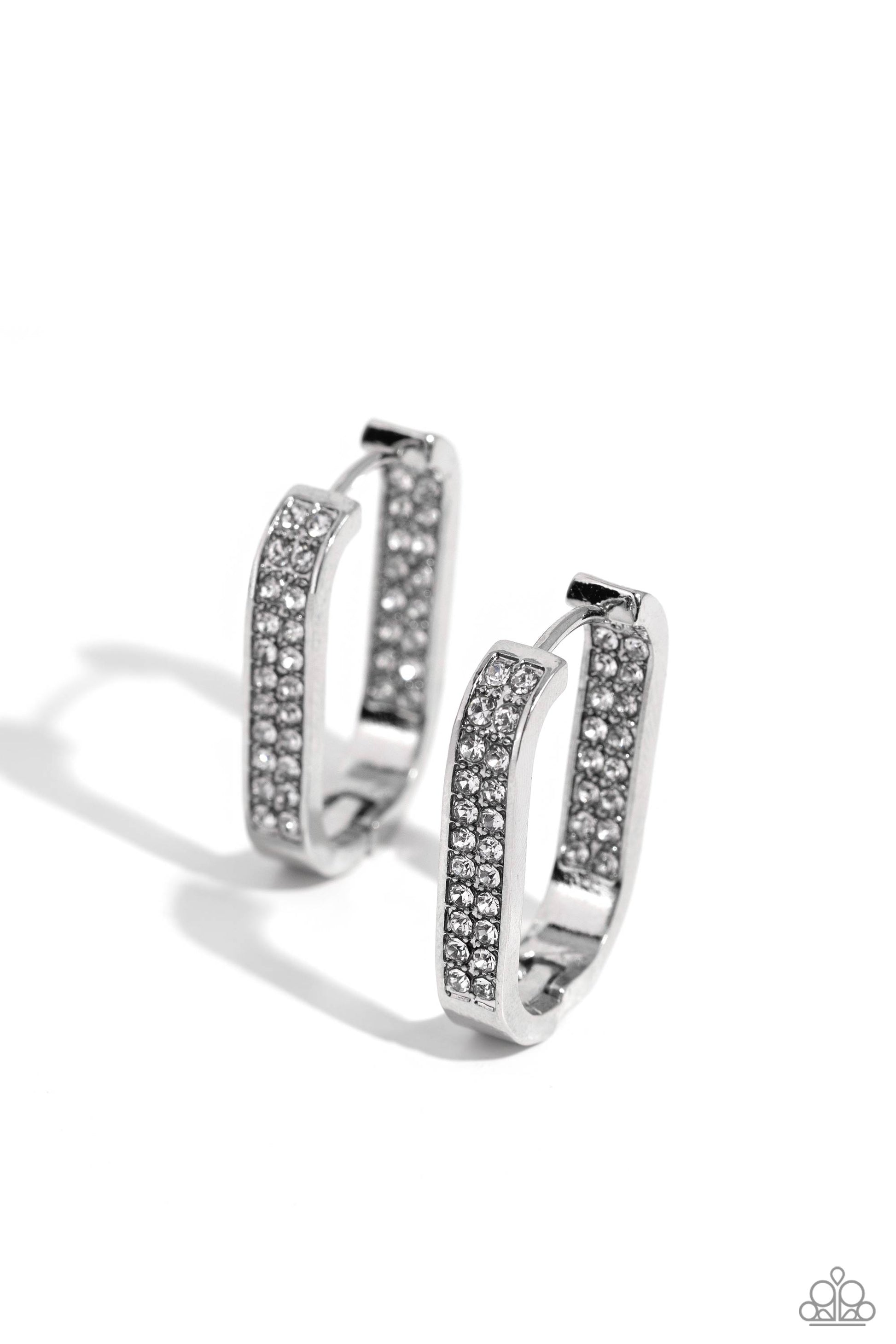Encrusted in rhinestones along the inner and outer curves, a thick silver bar sleekly curls into a U-shaped hoop, creating a hypnotizing look. Earring attaches to a standard hinge closure fitting. Hoop measures approximately 3/4" in diameter.