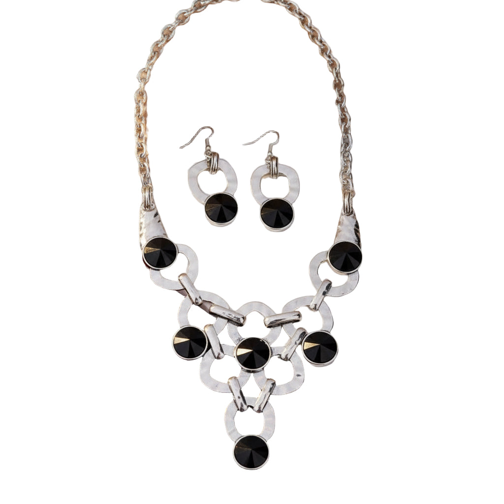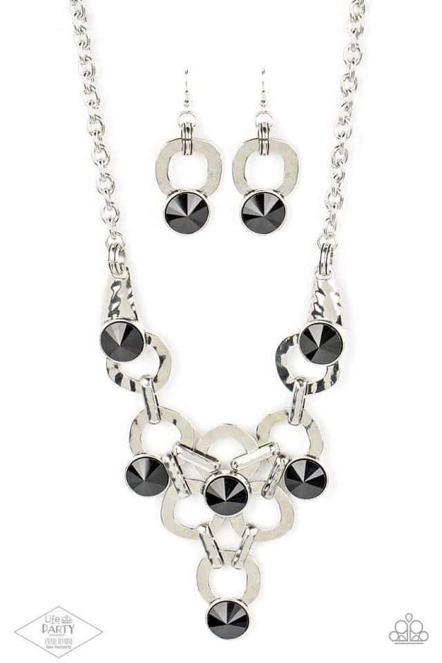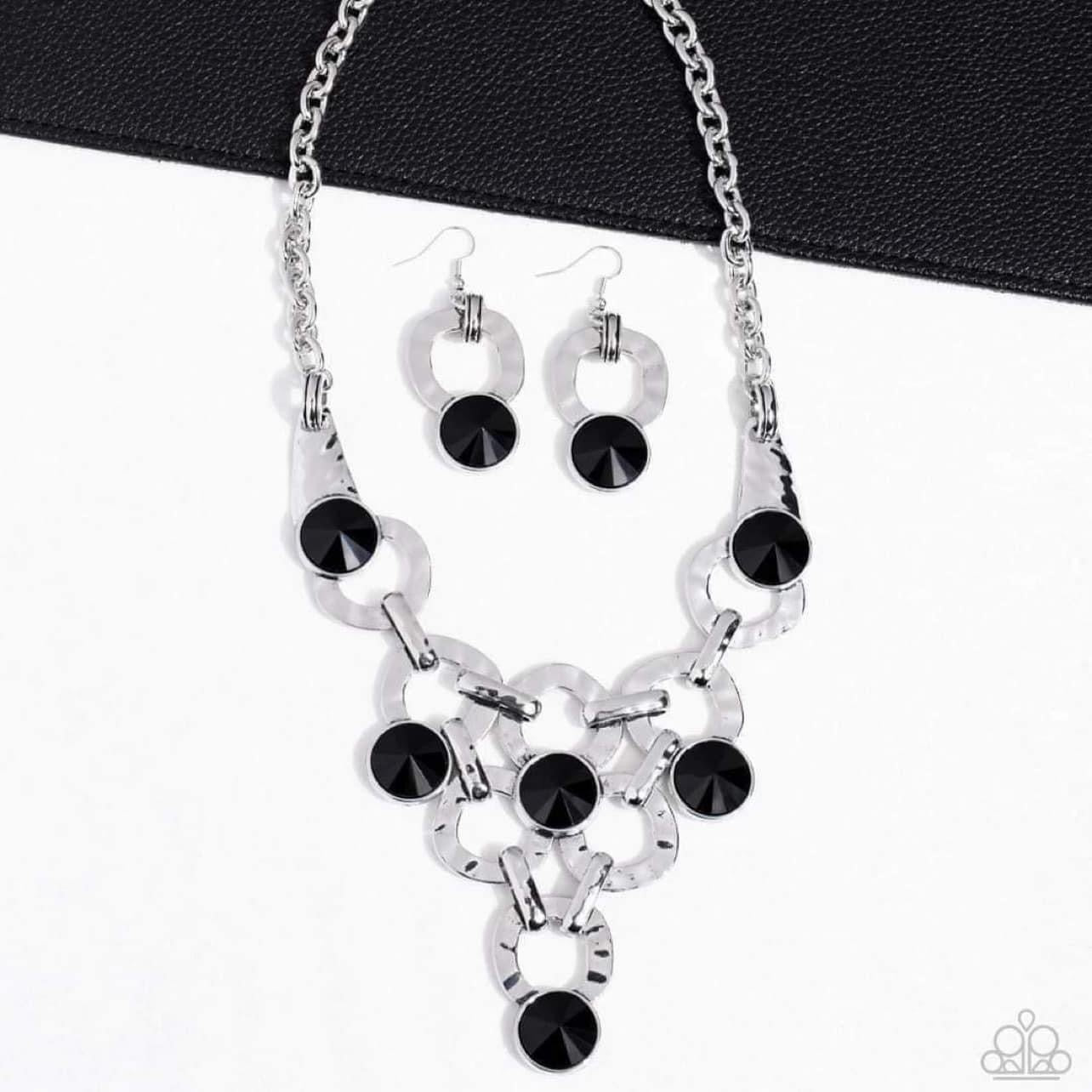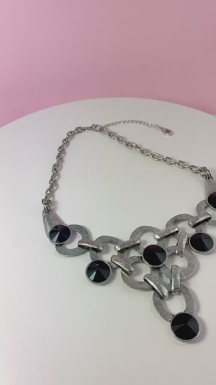 An oversized explosion of glittery black rhinestones, hammered silver links, and hammered oval fittings delicately connects into a metallic net below the collar for an intense industrial style. Features an adjustable clasp closure.